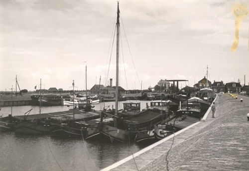 ![]() Stavoren, zomer 1957. Het witte scheepje aan de overkant van de haven is onze tjalk...? Op de foto is een kluiverboom te ontdekken en ook een fokkeboom. |