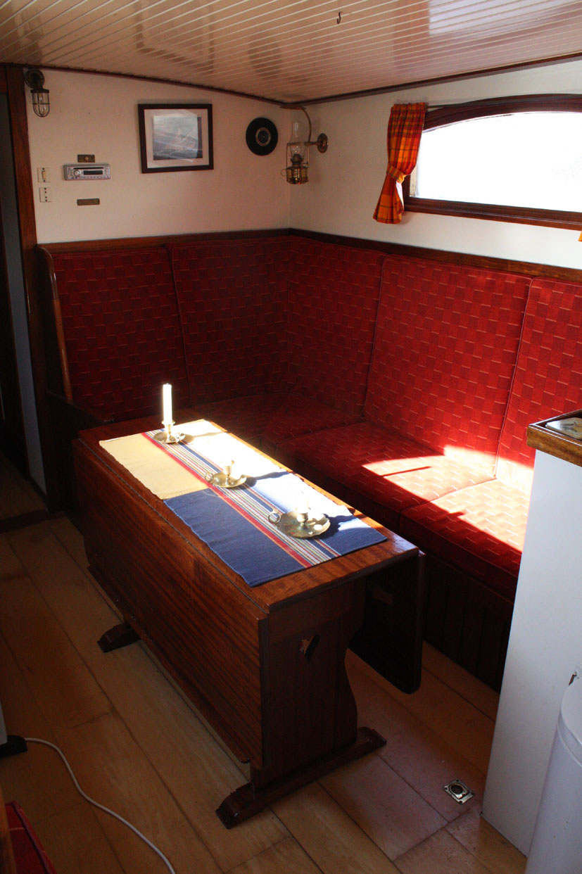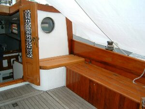 De kuip (links): let op het fraaie sierwerk in de deurtjes. Tegen de kajuit aan kun je zitten op de oude watertanks, wat inmiddels opbergruimte is geworden. De nieuwe watertanks zitten onder de banken in de kajuit. |