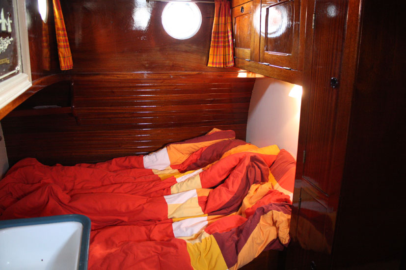 De mooie toegang op het voordek naar het vooronder, waar 5 slaapplaatsen zijn (meestal 1 in gebruik als zeilkooi). |